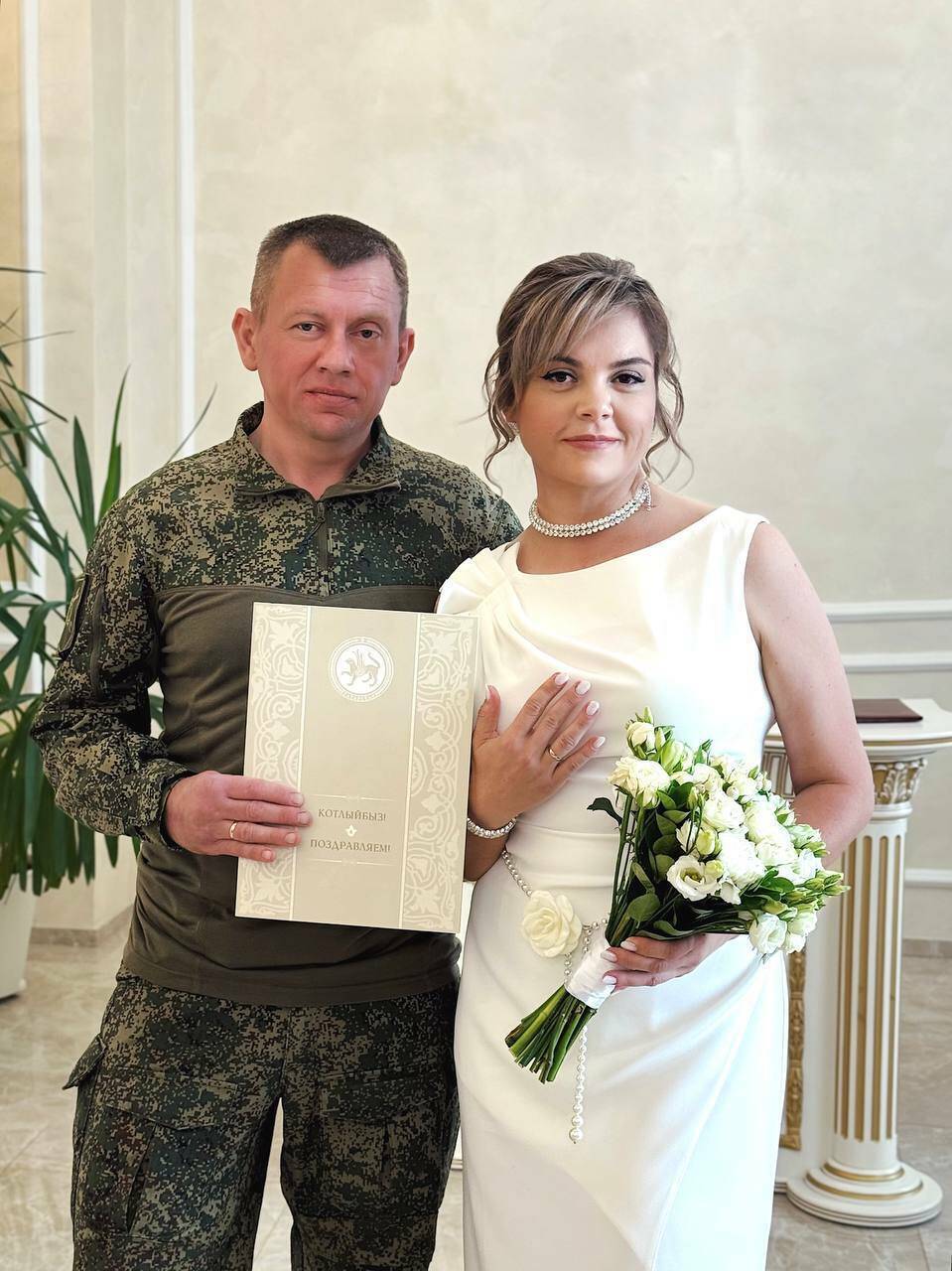 Молодой семье желают крепкого союза, долгой любви и счастья. А Сергею – скорейшего возвращения домой, к любимой жене и близким.