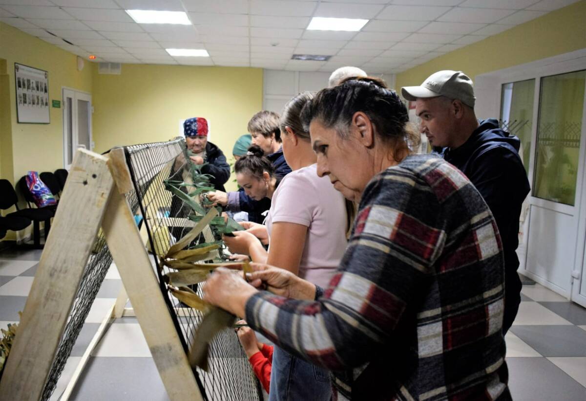 Каркасная конструкция для плетения состоит из деревянных брусьев и собирается легко. Мужчины установили ее в фойе дома культуры, женщины-волонтеры показали односельчанам порезанный на ленты спандбонд – именно из него делают маскировочные сети.
